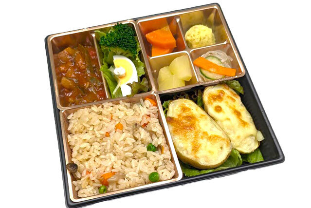 ポテトにチーズをのせて丁寧に焼き上げたベークドポテトに、野菜を中心としたヘルシー弁当です。ご飯はピラフになります。 ベジタリアン・ハラール の皆様以外にも安心してお召し上がり頂けます。