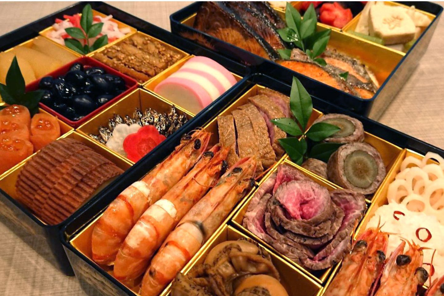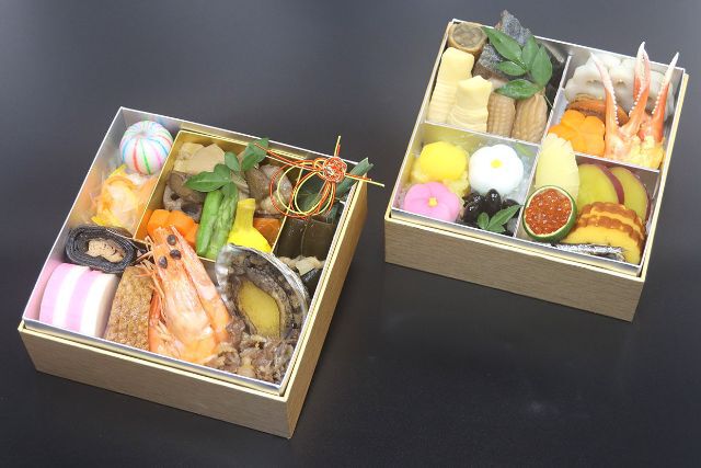 数の子/黒豆/田作り/栗きんとん/紅白蒲鉾/伊達巻/紅白膾/たたきごぼう/昆布巻き鰤照焼/祝海老艶煮/帆立甘煮/バイ貝甘煮/鶏松風/八幡巻き/花蓮根サーモン/ローストビーフ/鴨/蒟蒻、椎茸含め煮/松前漬け/菊花蕪/丸十密煮(献立内容は予告なく変更する事が有ります)