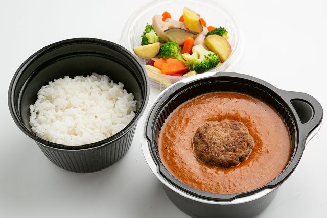 自家製ハンバーグとスパイスカレーが絶妙にマッチした豪華な一品。加熱容器でお届けします。温野菜とご飯も付いて、至福のひとときをお楽しみいただけます。