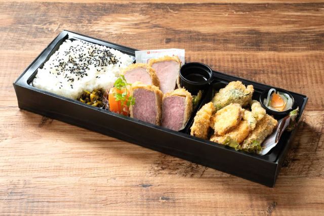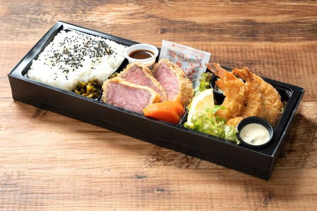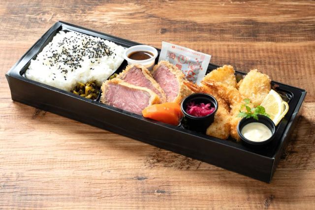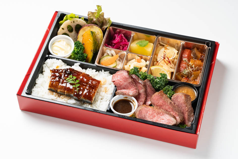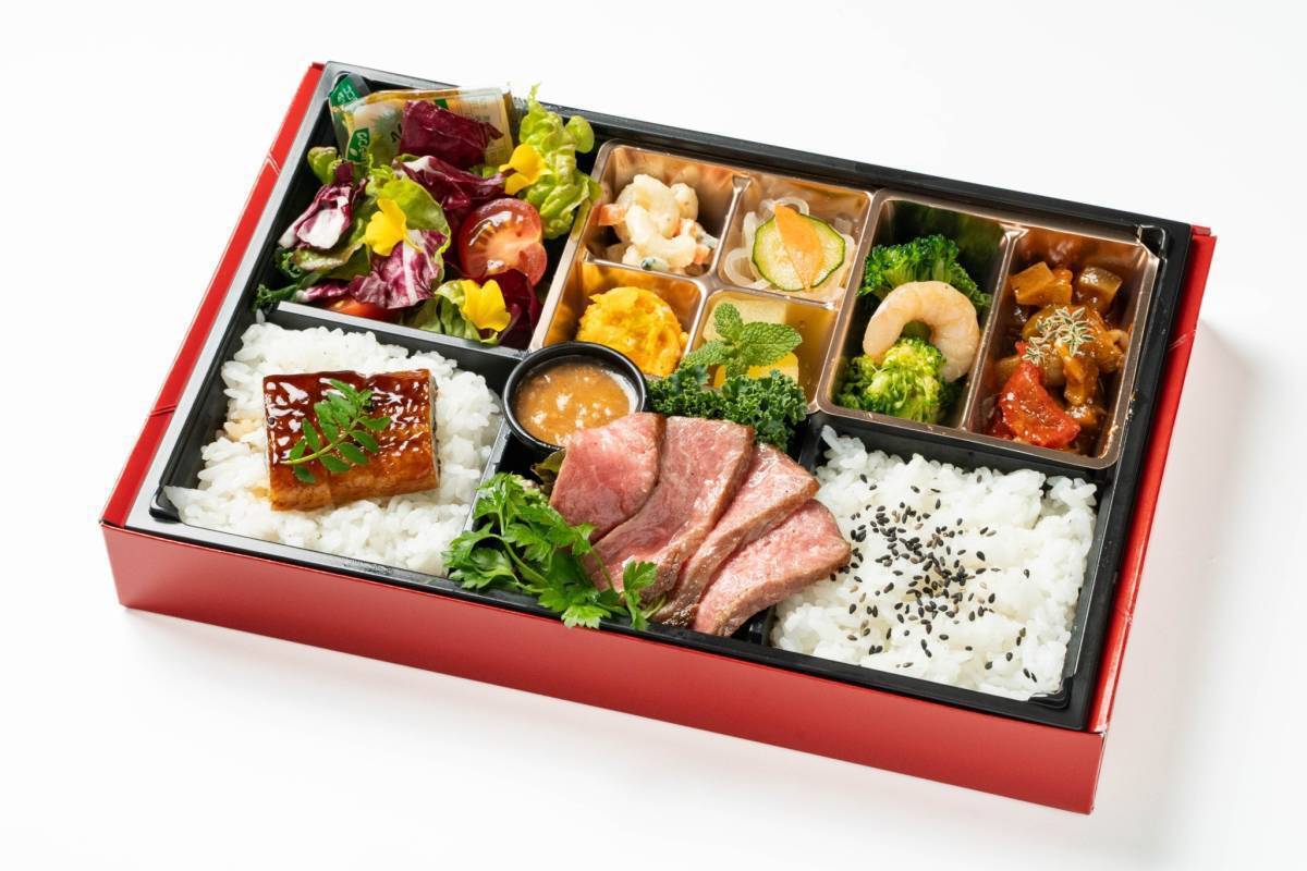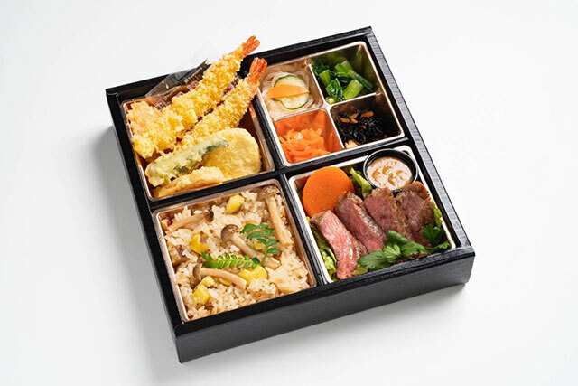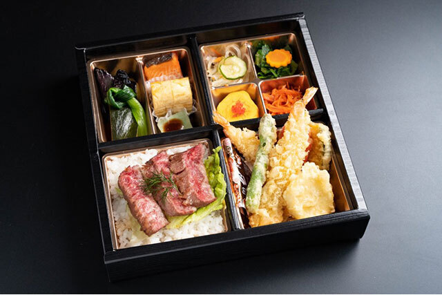 天婦羅とステーキ重の贅沢な組み合わせです。ステーキは低温調理で柔らかく、冷めても美味しい仕上がりです。フォーマンスに優れたおすすめのお弁当!
